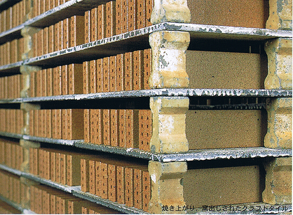 焼き上がったタイルは、2枚合わせの状態。これを冷却の後、瞬間的に割り離します。
